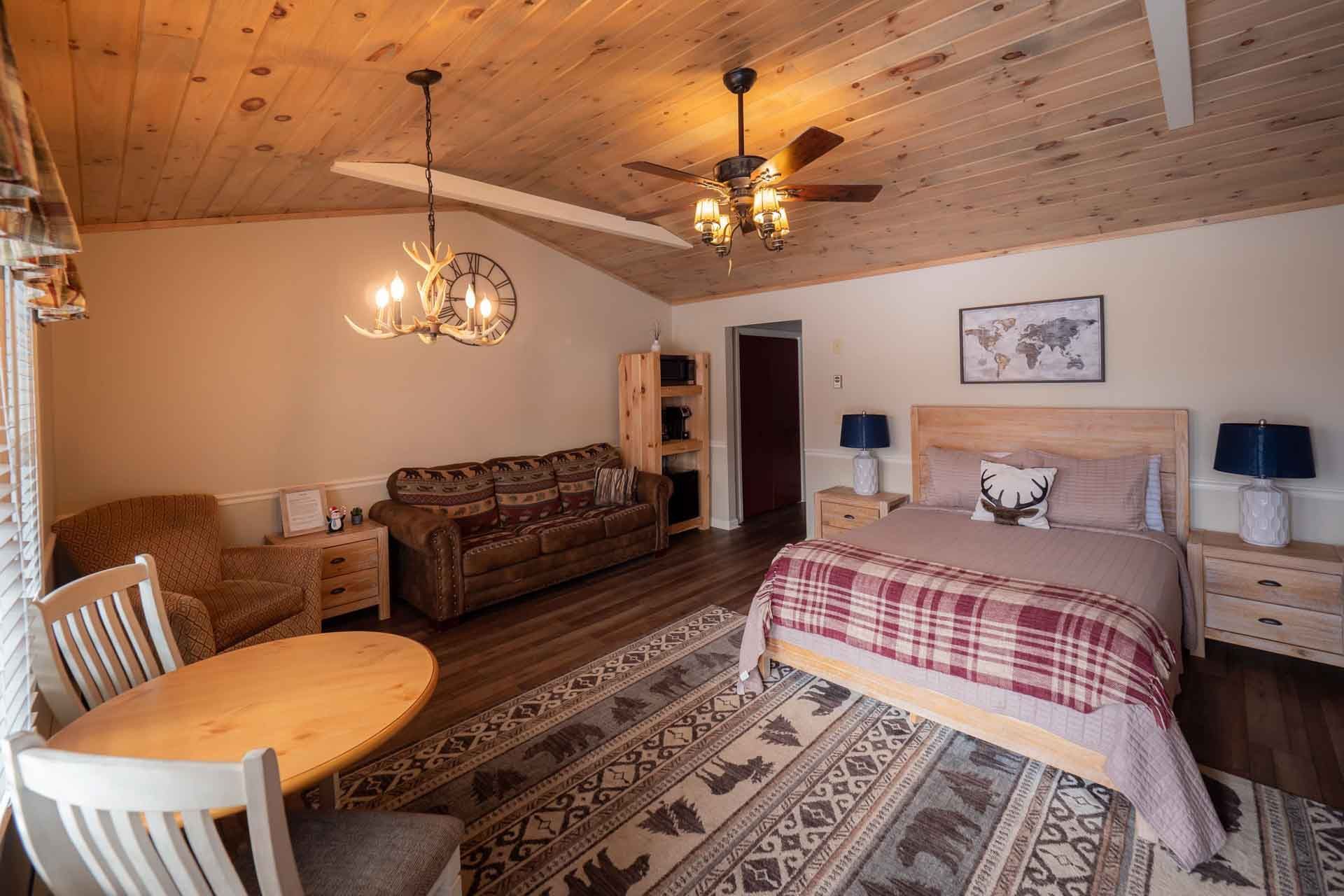 The Efficiency Studio has a queen bed and pull out couch and accommodates four people. This room also has a kitchenette with a coffee maker, microwave, and an electric cook top. It is outfitted with clothing storage, a small dining set, and Wi-Fi. The two bed suites also have a private, ensuite bathroom. All rooms include fresh linens and towels.